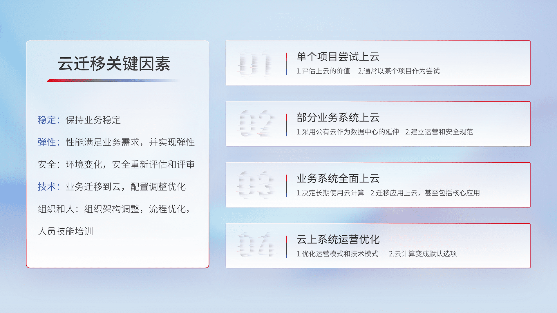 结合实际业务,,,,从规划设计、、、云平台选型、、云原生改造、、、、数据迁移、、集成交付,,,迁移全过程为客户识别最佳上云路径,,,,做好风险识别管理,,设计网络架构、、、、身份权限、、安全审计合规、、、操作审计、、、、日志审计、、、、监控告警策略、、多站点容灾设计等,,对云上基础设施进行整体规划,,,,提升IT治理水平,,以满足弹性、、、高可用、、、、高性能的需求。。